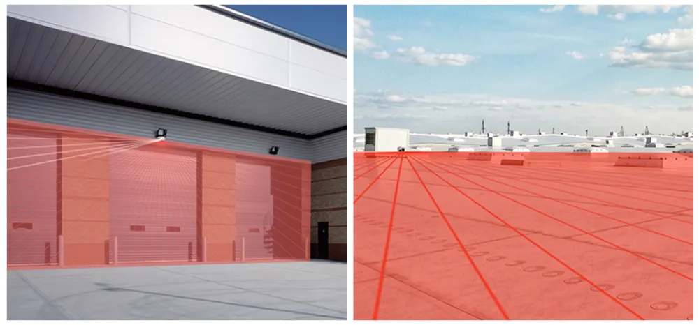 The REDSCAN sensors can be mounted vertically or horizontally to protect various points of entry on a building, including doors, windows, roofs, and skylights. Their virtual planes, or detection zones, can be further customized to allow for various alarm outputs. For example, these customizations could allow for a pre-warning zone near the main entrance, or a high-threat zone near the rear of the building.