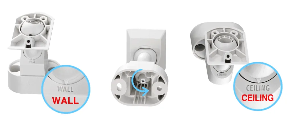 The FlipX also comes with an optional bracket. Using this bracket allows this sensor to be mounted on the ceiling or at different angles on a wall. The bracket is clearly marked “WALL” or “CEILING” so it can be easily distinguished depending on which option is required. To change the mounting option, you simply unscrew the screw located inside of the bracket, remove the bracket and rotate it into the new position, and reinsert the screw to lock the position.