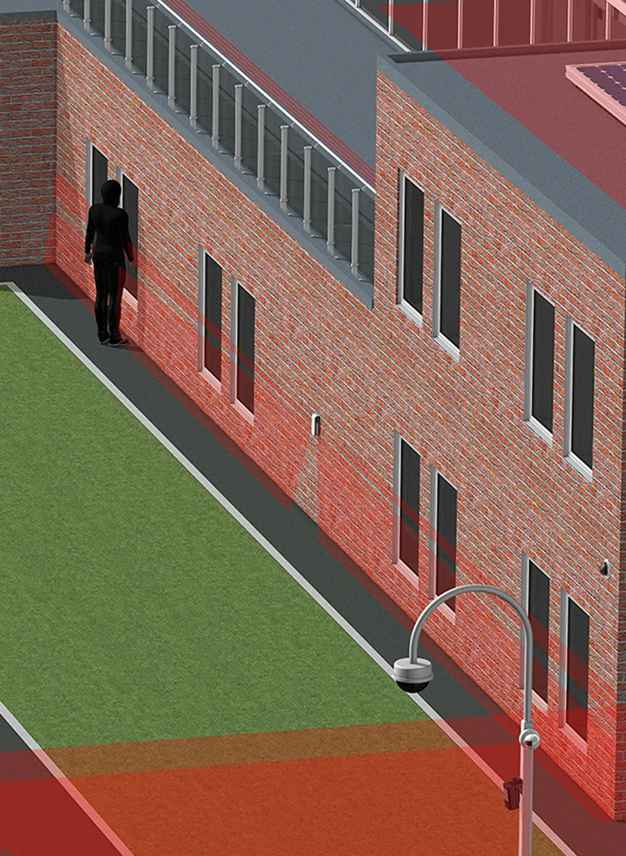 40' per side curtain detection, outdoor PIR sensor. Hardwired bi-colour model with anti-masking.