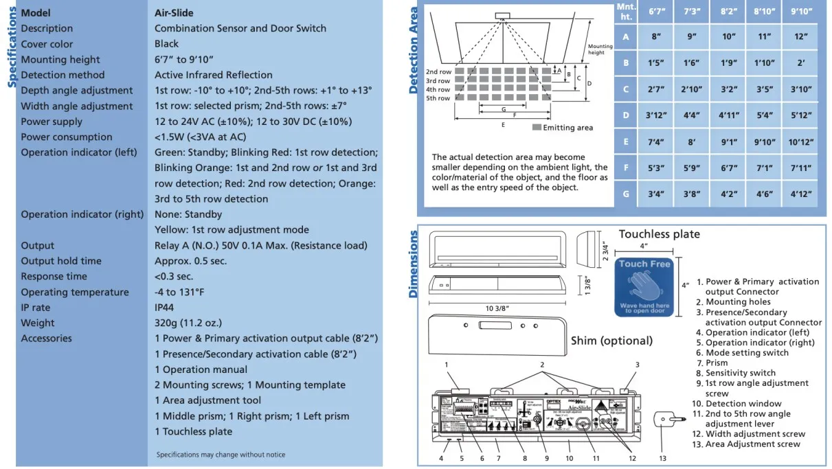 For use in Knowing Act Slide Door applications, the Air-Slide provides safety and convenience in one unit. The Air-Slide Active Infrared Door Sensor from OPTEX includes a built-in Touchless Switch. When the door is closed, the sensor operates as a virtual door switch, activating the door only when someone approaches the door and presents a hand near the sticker. This eliminates unwanted activations due to cross traffic. When activated, the Air-Slide provides safety throughout the threshold area keeping the door open until all people have moved away. Provide a high level of safety while eliminating cross-contamination points in your customer's facility with Air-Slide from OPTEX.