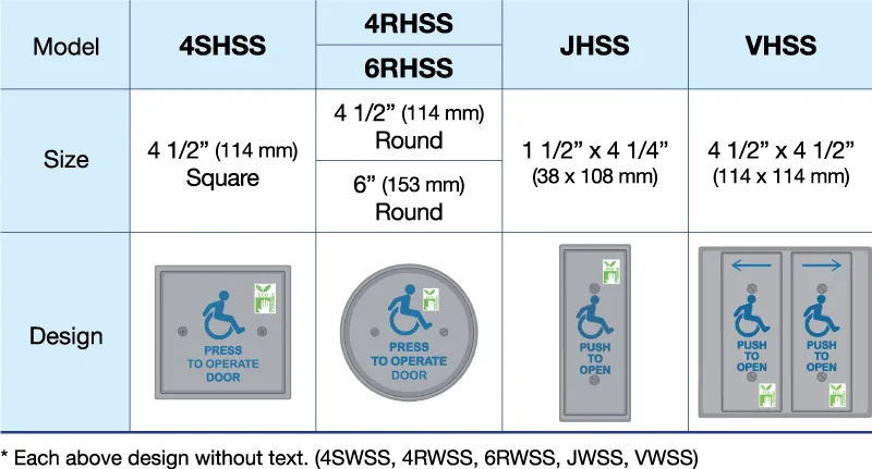 4" sq. vestibule NRG Switch, blue handicapped logo and "Push to Open" text with opposing arrows. Kit includes: (1) NRG-VHSS, (2) NRG-4HSS, (2) NRG-RX (pairing required)