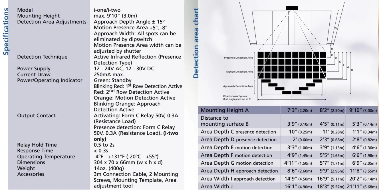 With its large motion and presence detection pattern, the OPTEX i-One Active Infrared door sensor features a safety zone in the threshold and sidelights that is always on. The size and shape of the detection pattern can be easily adjusted to match almost any application.