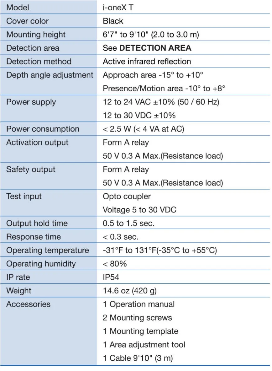 The i-oneX T has a wide and deep detection area that can cover not only the threshold area, but the sidelight area as well. The i-oneX T provides supplemental sidelight safety all from a single sensor. Provide your customers with the highest level of safety and functionality with the i-oneX T from OPTEX.
