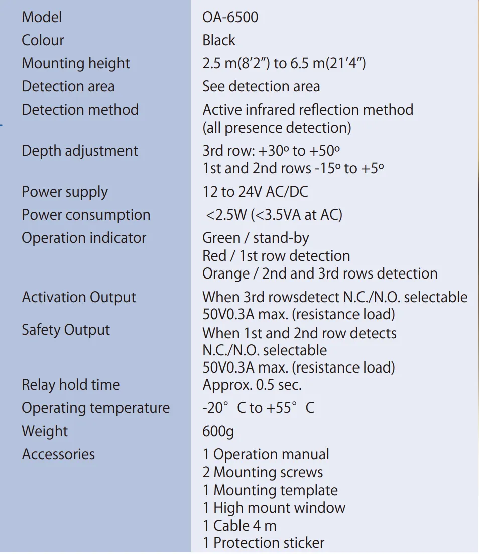 The OPTEX OA-6500 T uses active infrared technology to combine activation and safety in one sensor. By using the unique OPTEX presence detection technique, the OA-6500 T provides both maximum safety around the threshold of an industrial door and an extra-large motion detection area, even at mounting heights of up to 21'4".