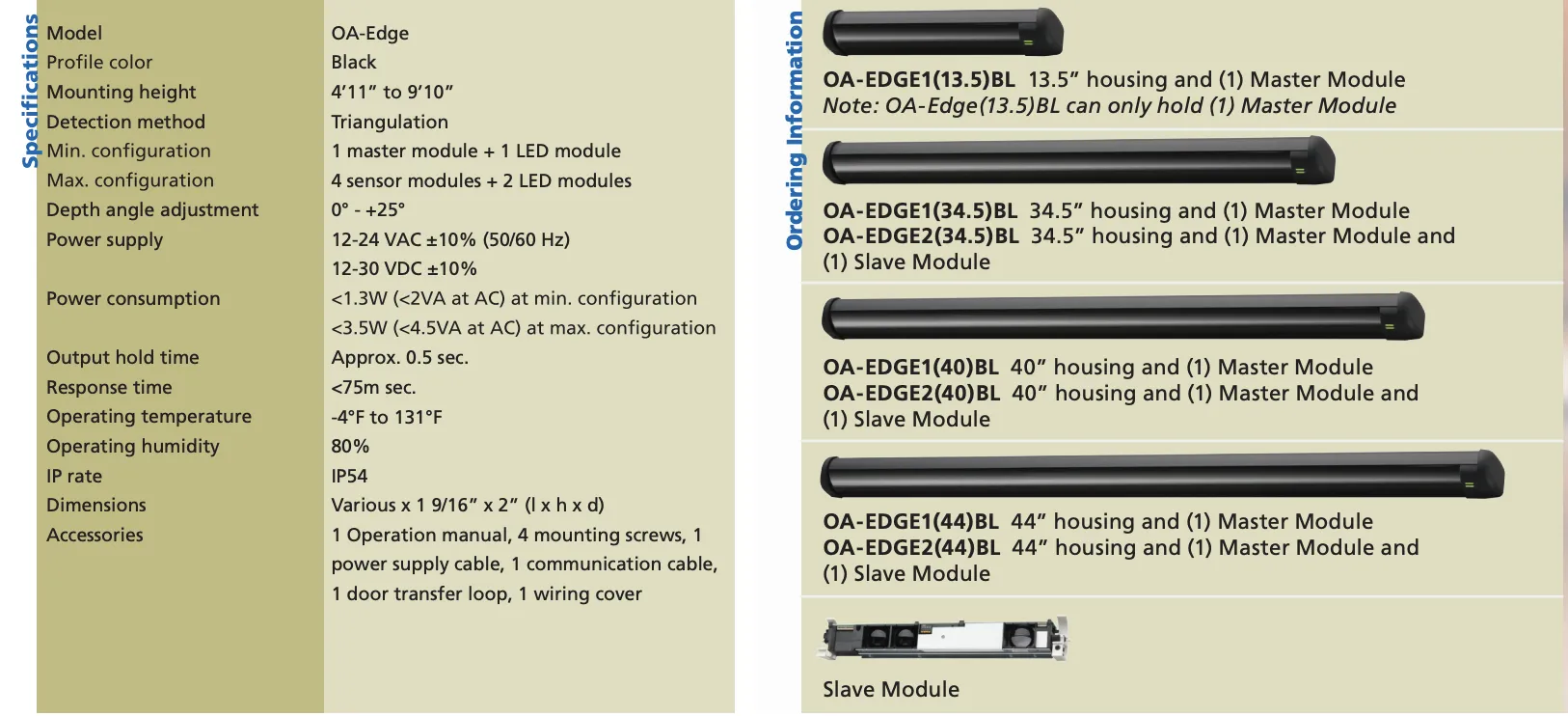 Design | The OPTEX OA-Edge series has a very slim design in order to fit on many different types of swing doors. The sensor is available in a black profile completed with a black lens. | |