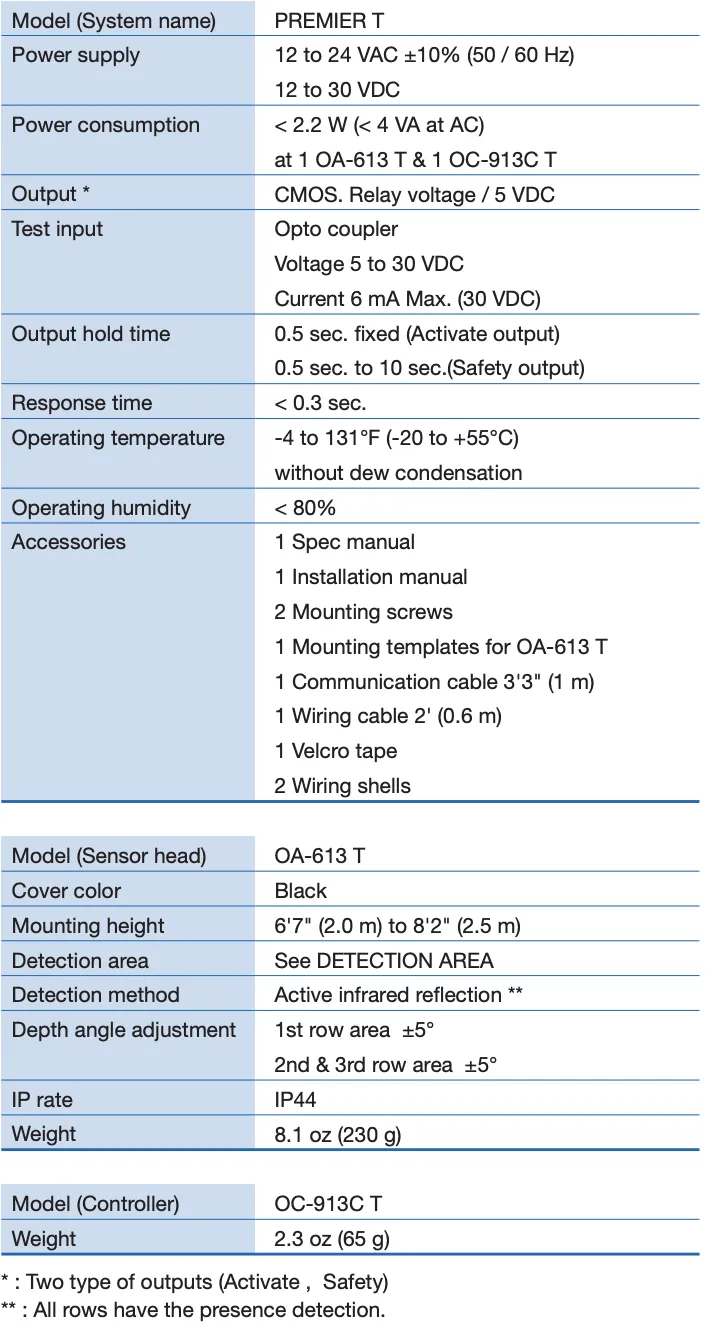 The OPTEX Premier T Active Infrared sensor for swing doors features full open / full closed swing area detection, universal compatibility with all door operators, and BLUEZONE™ technology for full open look-back through the threshold.