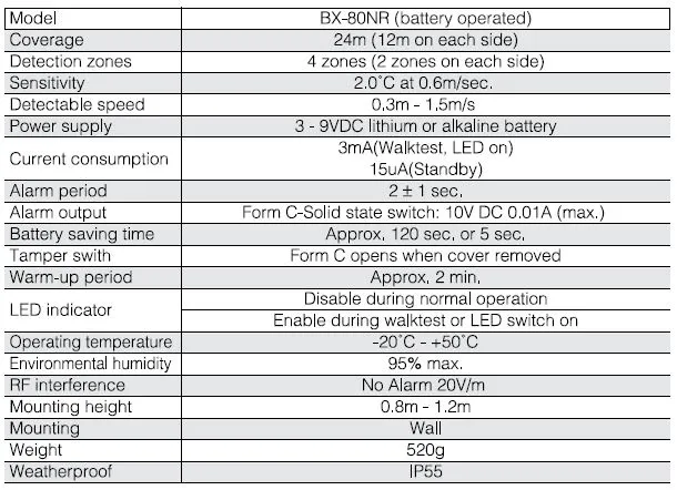 With long, narrow detection areas that extend from both its sides, the battery-powered BX-80NR is specifically designed to be wirelessly wall-mounted centrally on a building. This unique detection pattern covers the building perimeter with a multi-layered, horizontal barrier that detects intruders before they break in. Included on the unit is a backbox that accepts most manufacturers wireless systems, making the BX-80NR a versatile, stable outdoor PIR requiring no running wire. To help reduce false activations, the range can be adjusted so that detection extends only to the end of the building. The unit also has a size-judging function, which helps it discriminate between large and small objects within the detection area.
