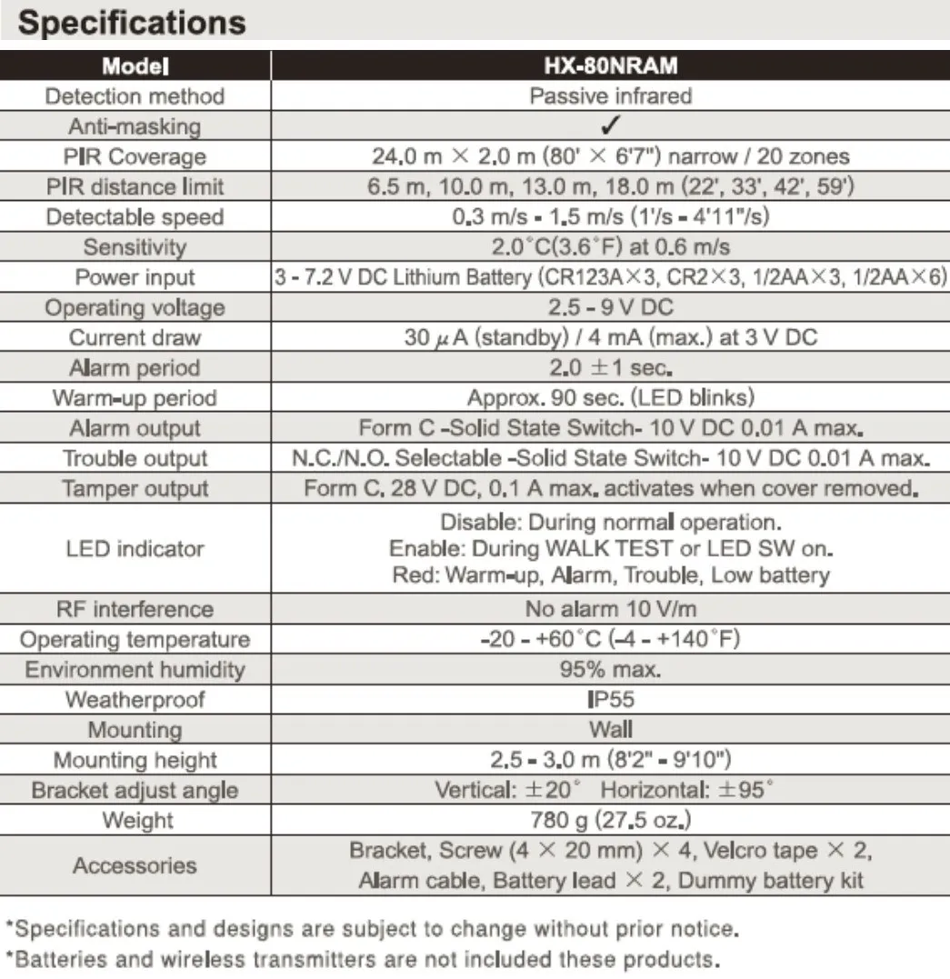 The HX-80NRAM is a high mount, battery-powered, outdoor passive infrared detector with Anti-Masking that provides the stability and reliability necessary for an outdoor PIR sensor. The battery-powered version accepts most manufacturer's wireless transmitters, and allows installers to save valuable installation time and labor costs because no trenching, installing conduit or pulling wire is required. The most important element in reliable outdoor detector is accuracy to distinguish a human from a small animal. The exclusive pyro element on board enables the HX to project an ideal detection pattern, thus allowing for more accurate detection of humans and less false alarms. In addition, the HX-80NRAM's dual PIR's and 20 detection zones utilize the 'AND' detection pattern technology - upper and lower detection areas have to be activated in order to generate an alarm condition. This technology helps to prevent false alarms caused by a pet or small animal. The HX Series' detection length can be limited to avoid unwanted detection, and it's short range zones can be masked if needed. By limiting the detection range, false alarms due to unwanted movement (cars, persons or animals outside the protected area) can be eliminated.