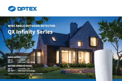 The QX Infinity (QXI) Series is a family of high or low mount outdoor PIR and dual-tech sensors providing a 120° wide and 40ft detection area. The new Quad-Element technology provides highly reliable detection performance within a compact and sleek design, fit for any residential or commercial applications. It also features OPTEX’s sensing analytics, called the Super Multi-Dimensional Analysis (SMDA), to reduce any noise created by the environment.