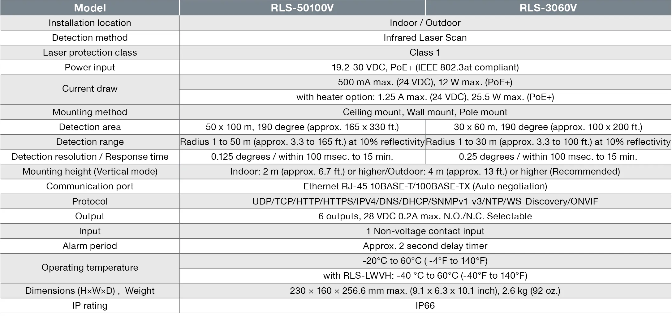 Part of the ONVIF profile S conformant REDSCAN Pro Series, RLS-50100V is the long-range LiDAR sensor providing very accurate detection of intruders and moving objects within a range of 165 ft. x 330 ft. (50 m x 100 m), without any gaps and keeping the same detection resolution in the near and far. Equipped with OPTEX's most advanced technology it provides excellent detection performance not affected by variable lighting, temperature or environmental changes, making it the best solution for high security sites. [Certification Required]
