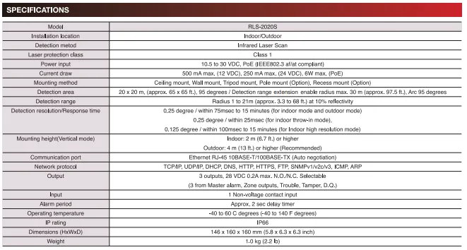 With its powerful processor, the RLS-2020S can be deployed in outdoor environments, and has a number of environmental resistance features to further minimize false alarms in all kind of weather conditions.