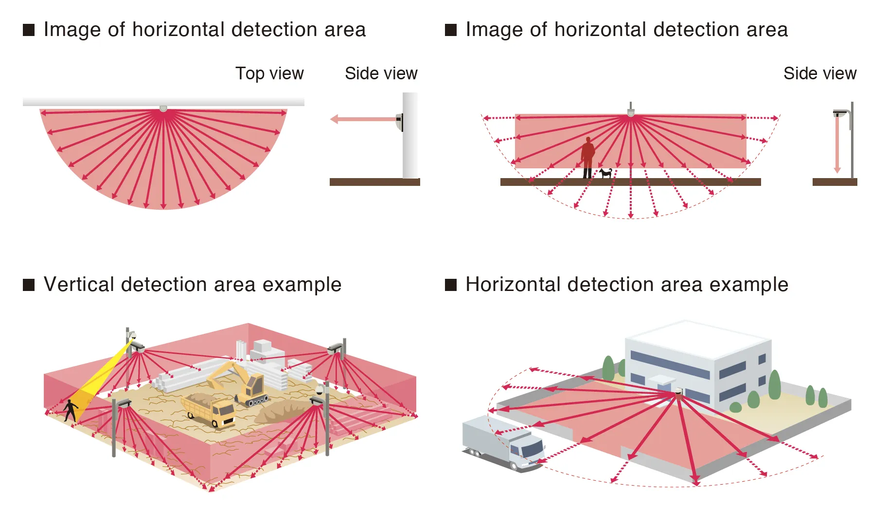 When vertical detection area is selected, it creates a maximum 60m (200ft.) detection area that functions like an invisible wall. When horizontal detection area is selected, it creates a detection area with a radius of maximum 30m (100ft.) and an arc of 190°.