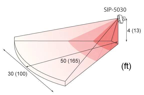 The SIP-5030 offers wide angle-detection for triggering CCTV systems in large areas outside. It has an intelligent detection system that uses data from the ambient environment, such as temperature and illuminance conditions, to automatically adjust the sensitivity. In addition, the SIP-5030 has a seperate PIR detector at the bottom of the unit to cover the creep zone area. This second creep zone PIR has an independent output that is separate from the main output, and can be used to protect the area around the detector while the main output can trigger the CCTV system. The detection angle in the main area of the SIP-5030 can be adjusted to easily match a camera's field of view and the unit is also equipped with anti-rotation and anti-masking functions, which can detect vandalism or tampering with the unit.