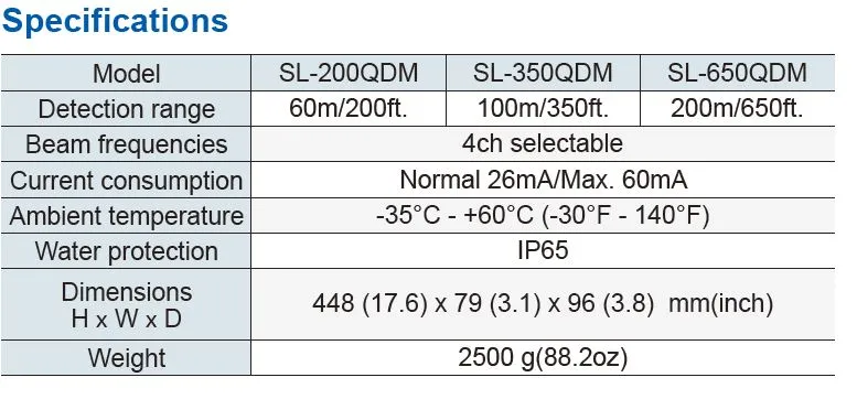 The SL-200QDM includes even more features to protect against false and missed alarms caused by mis-alignment and environmental issues. With 200ft. of outdoor detection range and 4-channel beam frequency selection, the QDM model is perfect for high security perimeter applications. New features include: