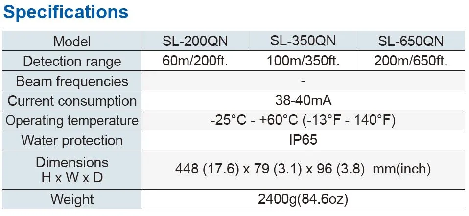 The new SL-650QN includes even more features to protect against false and missed alarms caused by mis-alignment and environmental issues. With 650ft. of outdoor detection range, the QN model is perfect for mid level security perimeter applications. New features include: