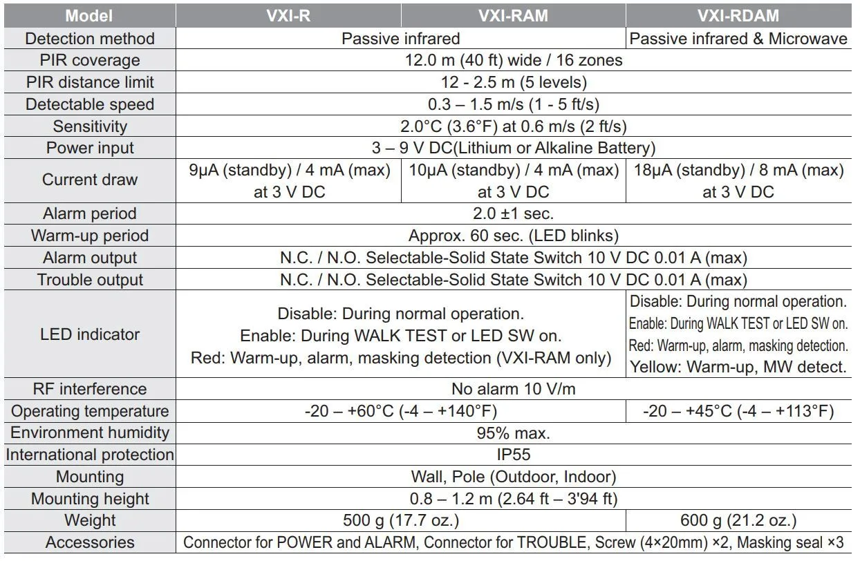 SMDA logic (Super Multidimensional Analysis): All VXI models are equipped with a digitally enhanced signal recognition logic called SMDA. SMDA improves immunity against various noise factors such as climate changes and vegetation sways. VXIs expands applicable fields and reliability beyond what VX-402 was capable.