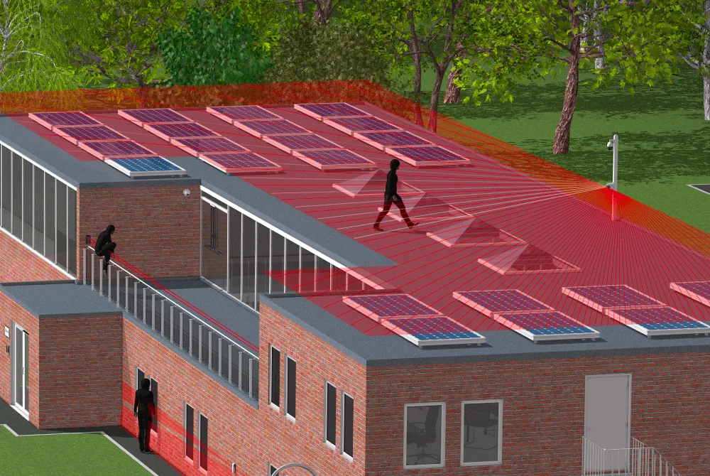 REDSCAN LiDAR, REDWALL Curtain-style PIR detectors, and AIR beams protect vulnerable building entry points, rooftops, and facades by monitoring narrow zones and creating virtual walls for precise, real-time intrusion alerts.