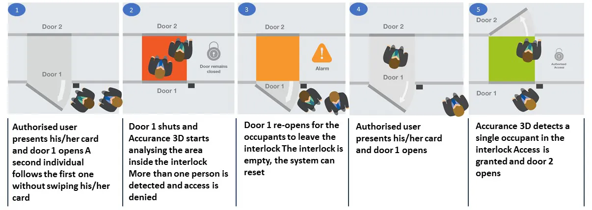 Accurance 3D is a tailgating detection system designed for high security two door interlocks. It adds a layer of security to the access control system by ensuring single occupancy inside the interlock.