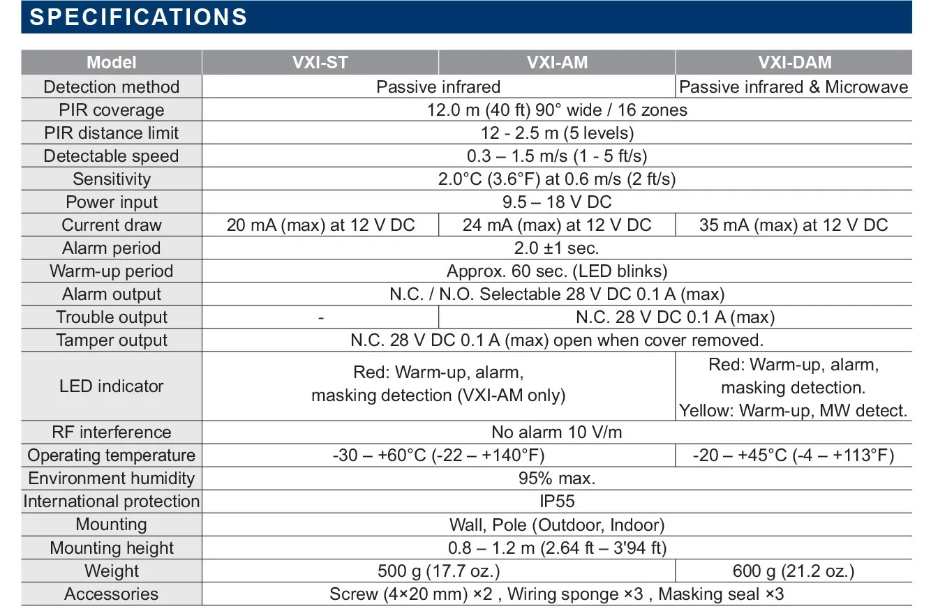 SMDA logic (Super Multidimensional Analysis): All VXI models are equipped with a digitally enhanced signal recognition logic called SMDA. SMDA improves immunity against various noise factors such as climate changes and vegetation sways. VXIs expands applicable fields and reliability beyond what VX-402 was capable.